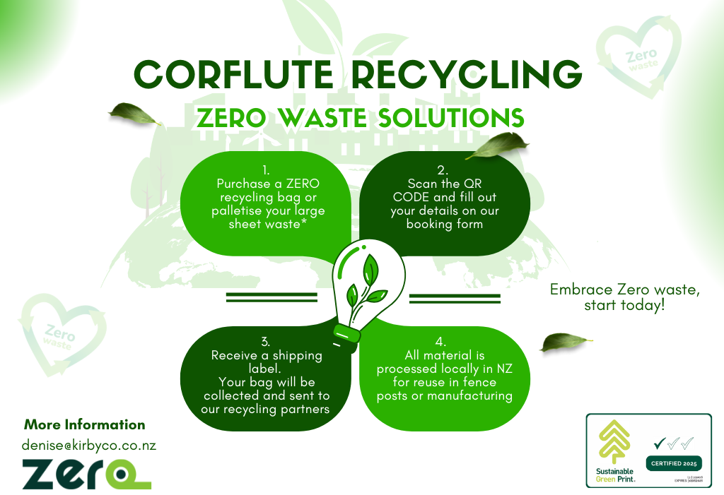 Just purchase a ZERO Bulk Bag, cut up your corflute ensuring its clean and staple free, then scan the QR code on the bag tag to book a collection. Your corflute will be recycled right here in NZ and used to make sustainable fence posts or in other manufacturing.